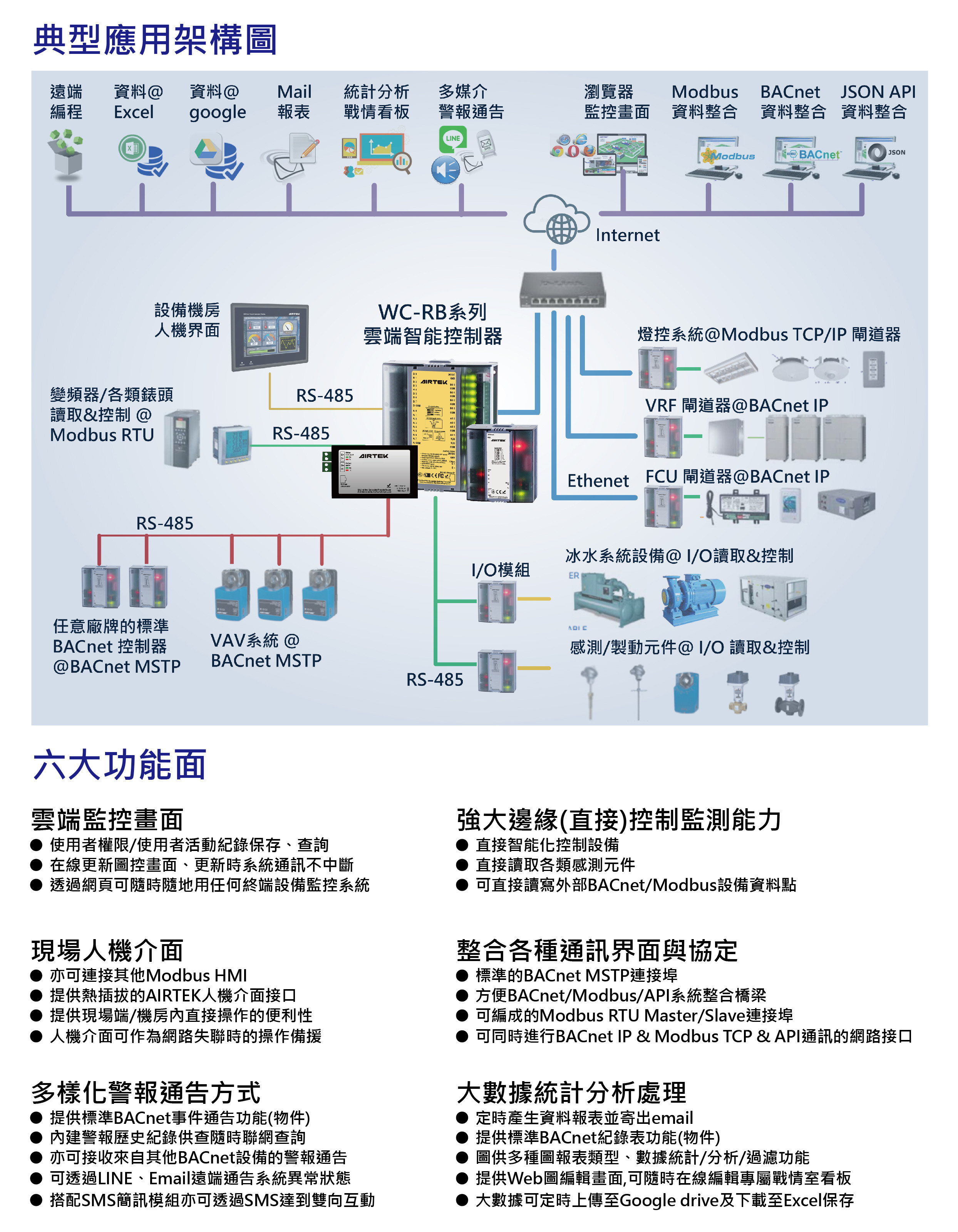 向暘科技全新升級【BACnet雲端智能控制器】整合了WC+BEMS提供: 1.不論容量大小,該有的功能一樣不少 2.一台控制器即可提供一套完整智慧化系統所有功能 3.依建築容量大小區分不同等級,不論預算多少皆可滿足 4.舊系統也可以透過外加本產品達到功能性的提升而無須全系統汰換 5.支援BACnet,Modbus,JSON API等多種開放的通訊協定,系統擴充&整合不受限 6.雲端監控+可程式控制+大數據圖報表分析+多媒體警報+通訊資料轉換+I/O控制 1. 小型廠戶/建築透過WC智能控制器將現場個空調/燈光/機電等系統直接升級整合為為智慧化樓控系統